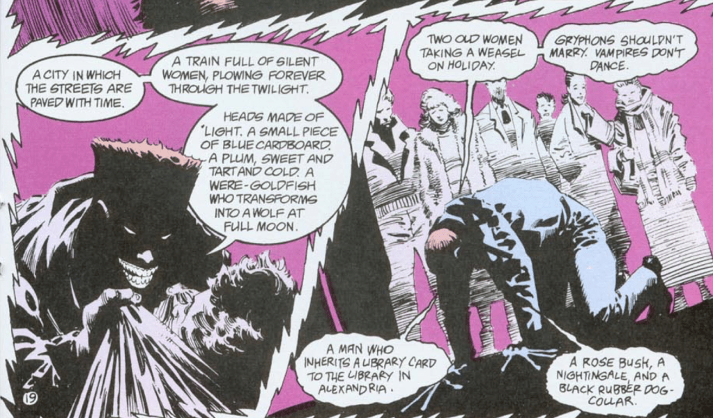 I remembered one of Neil Gaiman’s Sandman stories: Calliope, from the Dream Country collection. In it … well, there’s a panel where Mr. Gaiman just drops a slew of awesome story premises, without pomp or circumstance. I couldn’t imagine a better starting place for a writing exercise.